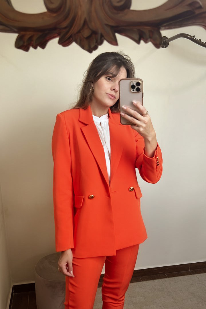 Blazer estruturado, levemente acinturado, e comprimento alongado na altura do quadril. Feito com ombreira. Aba embutida frontal não funcional. Fechamento com transpasse em botão duplo, de metal em banho ouro. Manga com abertura (não funcional) com detalhes em botões metal banho ouro. Peça toda forrada internamente.
